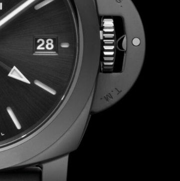 The PAM01460’s most striking feature is its case. Crafted from matte-black ceramic, it offers exceptional scratch resistance and a distinctive, stealthy look that is both modern and understated. The 44mm diameter is classic Panerai, providing excellent legibility and a commanding wrist presence that harkens back to the brand’s origins as a supplier to the Italian Navy’s elite dive units.
