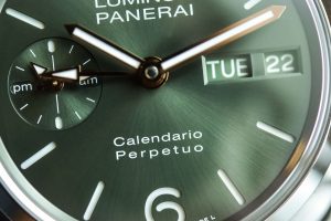 The dial of this new Panerai Luminor Perpetual Calendar PAM00715 may be the most eye-catching element. The brand combines platinum with a relatively soft green dial, a classic sandwich structure and a sun pattern brushed pattern.