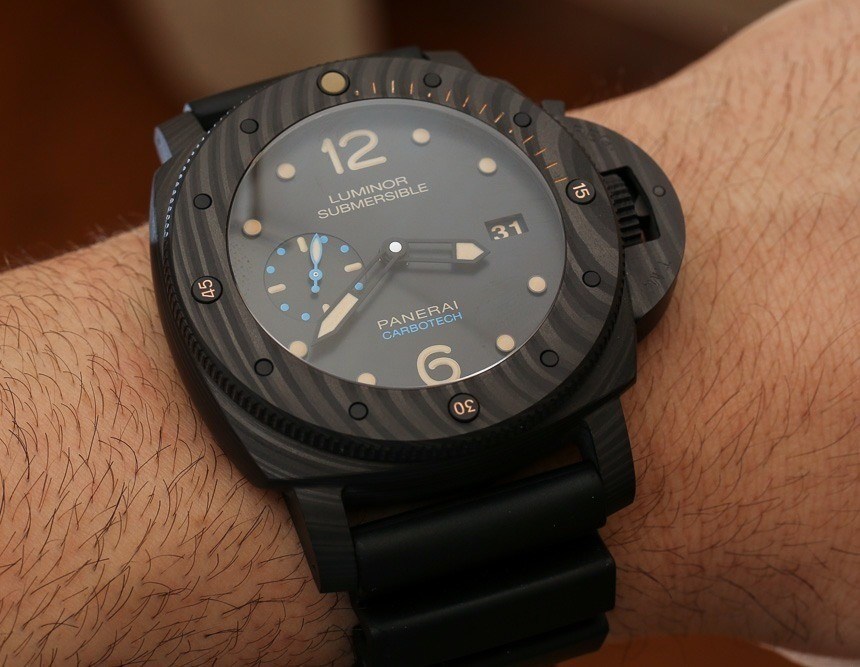 Inside the Panerai Luminor Submersible 1950 Carbotech 3 Days Automatic PAM616 is the Panerai Replica in-house made Calibre P.9000 automatic movement with three days of power reserve operating at 4Hz. On the dial, you have the time with subsidiary seconds dial and the date. In addition to the aged lume color on the hands and hour markers, you get a new blue color on the dial meant to highlight the “modern” look of the Luminor Submersible Carbotech – and in a lot of ways, it succeeds.
